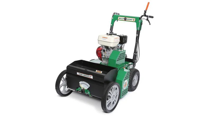 Billy Goat’s self-propelled overseeder reduces fatigue associated with pushing and features intuitive forward and reverse operator controls. New to the unit is a blade design that reduces thatch and improves blade life due to its sharpened leading edge and attack angle combined with a new foot actuated height adjust that raises and lowers the reel effortlessly, providing more blade depth. The unit is 22” wide with an exclusive 11-blade slicing reel that floats along contours of yards increasing seed to soil contact and improving germination rates.